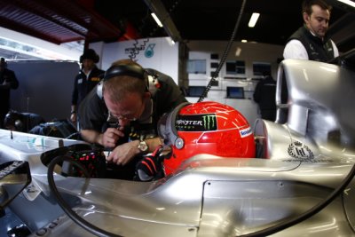 Formel 1, Testfahrten, Barcelona, 18.-21.02.2011 Mercedes GP-Box Michael Schumacher, Mercedes MGP W02 Mercedes GP-Techniker Mark Slade