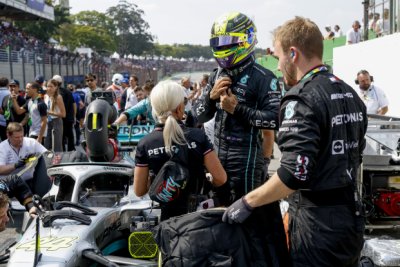 Formel 1, Grand Prix Brasilien 2022, Sao Paulo, 13.11.2022 Startaufstellung Mercedes AMG-Mechaniker Angela Cullen Lewis Hamilton (2.), Mercedes-AMG F1 W13 E Performance
