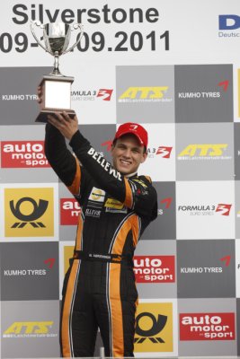 Formel 3 Euro Serie, Silverstone, 10.09.2011 Rennen 2 Siegerehrung Sieger Marco Soerensen mit Pokal